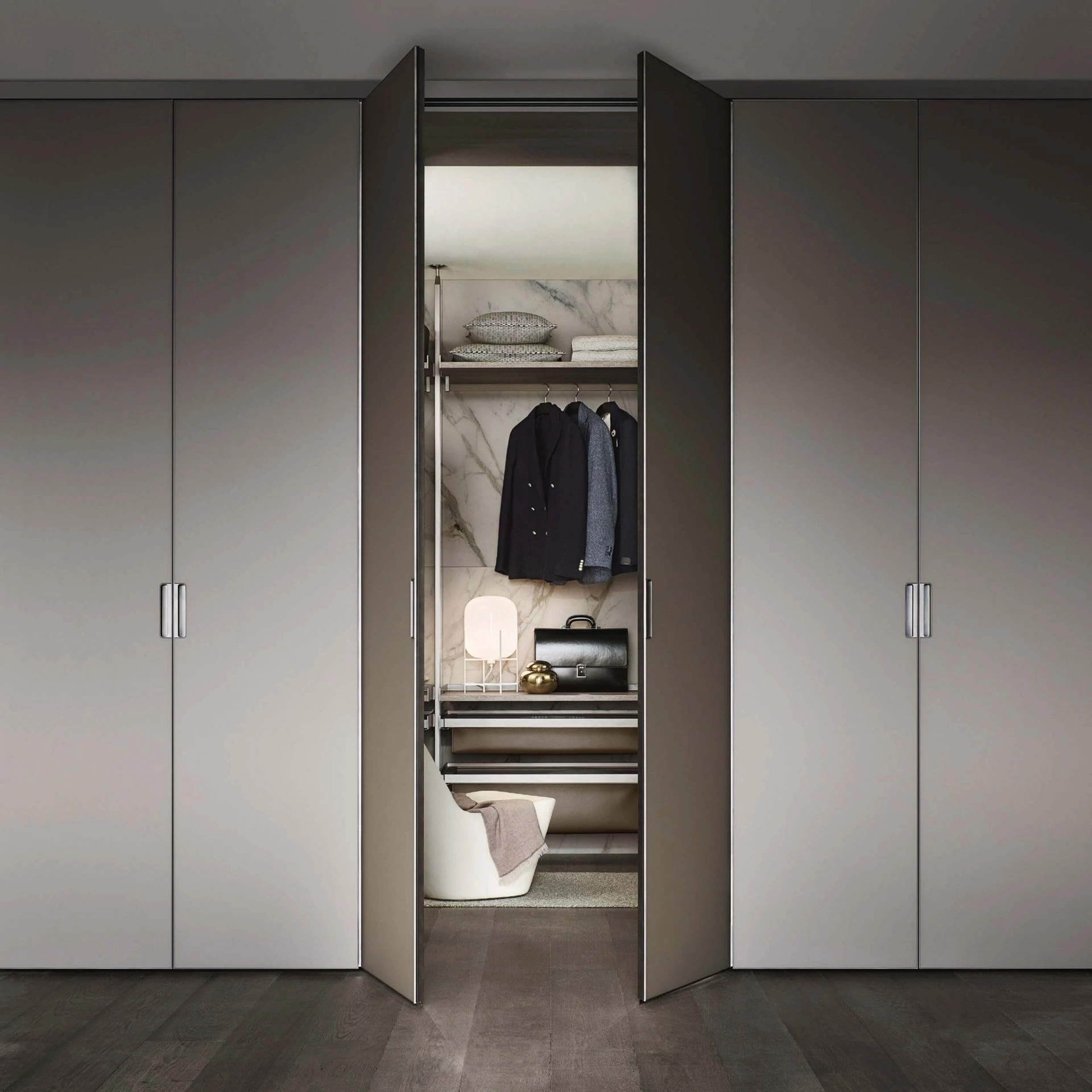 Se desideri armadi a muro con ante battenti, clicca e scopri l'armadio Cover Freestanding Grigio Ombra di Rimadesio in vetro.