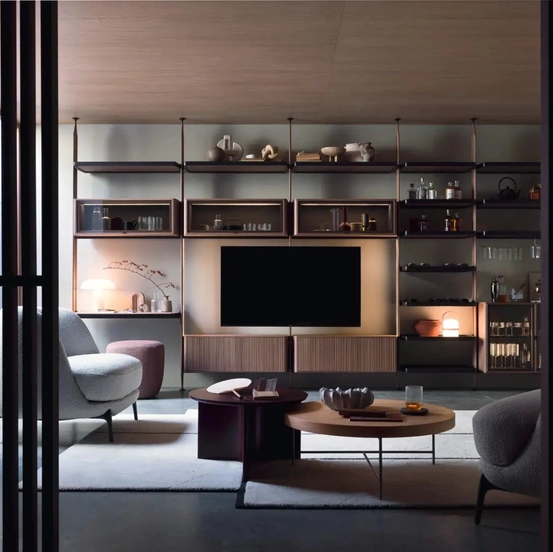 Vuoi arredare un living pratico e operativo? Ti offriamo la parete attrezzata Abacus Platino Rimadesio dalle forme decise moderne.