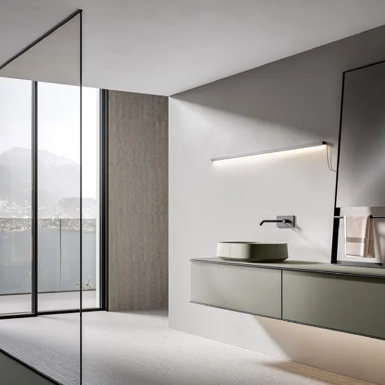 Arreda la stanza del benessere moderno alla perfezione con Crio 007, mobili bagno sospesi e complementi in laccato opaco di Edoné.